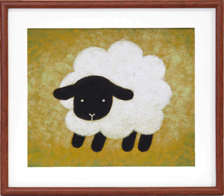 | 雲のようなふわふわな羊さん、顔と手足は黒、サフォーク種系のひつじ、動物が持つやさしさを表現したくてこのモチーフを選びました。背景は羊の白が引き立つように、オリーブグリーンでナチュラル感を出しました。1頭の羊がこちらを見つめて何かを語りかけているよう…今夜はいい夢見れるかな? |