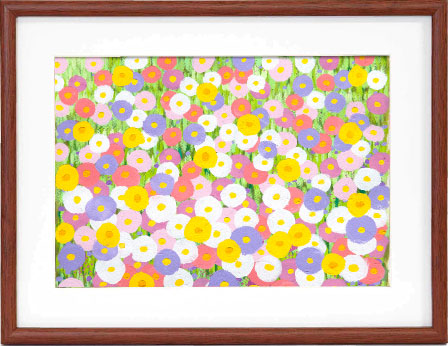| タイトルどおり、夢でよく見る花畑です。ピンク・黄色・紫・白の淡いパステルカラーの色とりどりの花が一面に広がります。こんな世界の中にずっといたくなります。デージーのような花です。何色もの花を上から描き足しています。お部屋がホッと明るくなる、リビング、子供部屋にオススメ。 |
