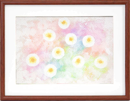 | ふわふわの淡いレインボーカラーのグラデーションを表現しました。淡い淡い色です。色調を抑えるため、さらに白でボカしています。レインボーの背景に、白の水玉、花芯を描いて花にしました。花芯の黄色は敢えてぼかして、やさしい黄色にしました。サイズは小さめ、リビング、ベッドルームなどにオススメサイズです。 |