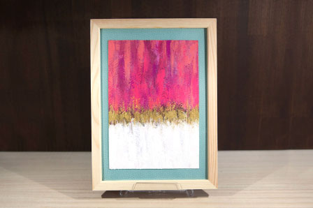 | 鮮やかなピンクとタッチの残るホワイト、ゴールドをアクセントに。色とタッチを楽しむ抽象画です。キレイなピンクを表現するよう、同じピンクでも微妙な色の変化を作り、奥行きのある雰囲気にしました。小さめの絵ですので、玄関などに飾って華やかさをアップさせるのにおススメです。 |